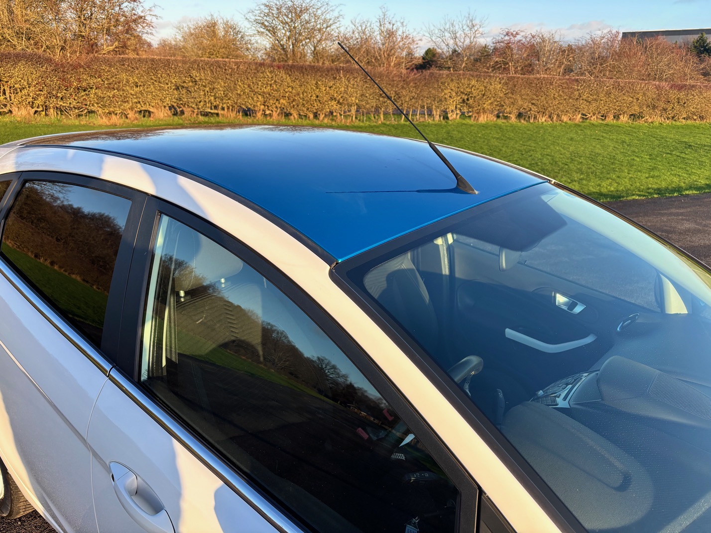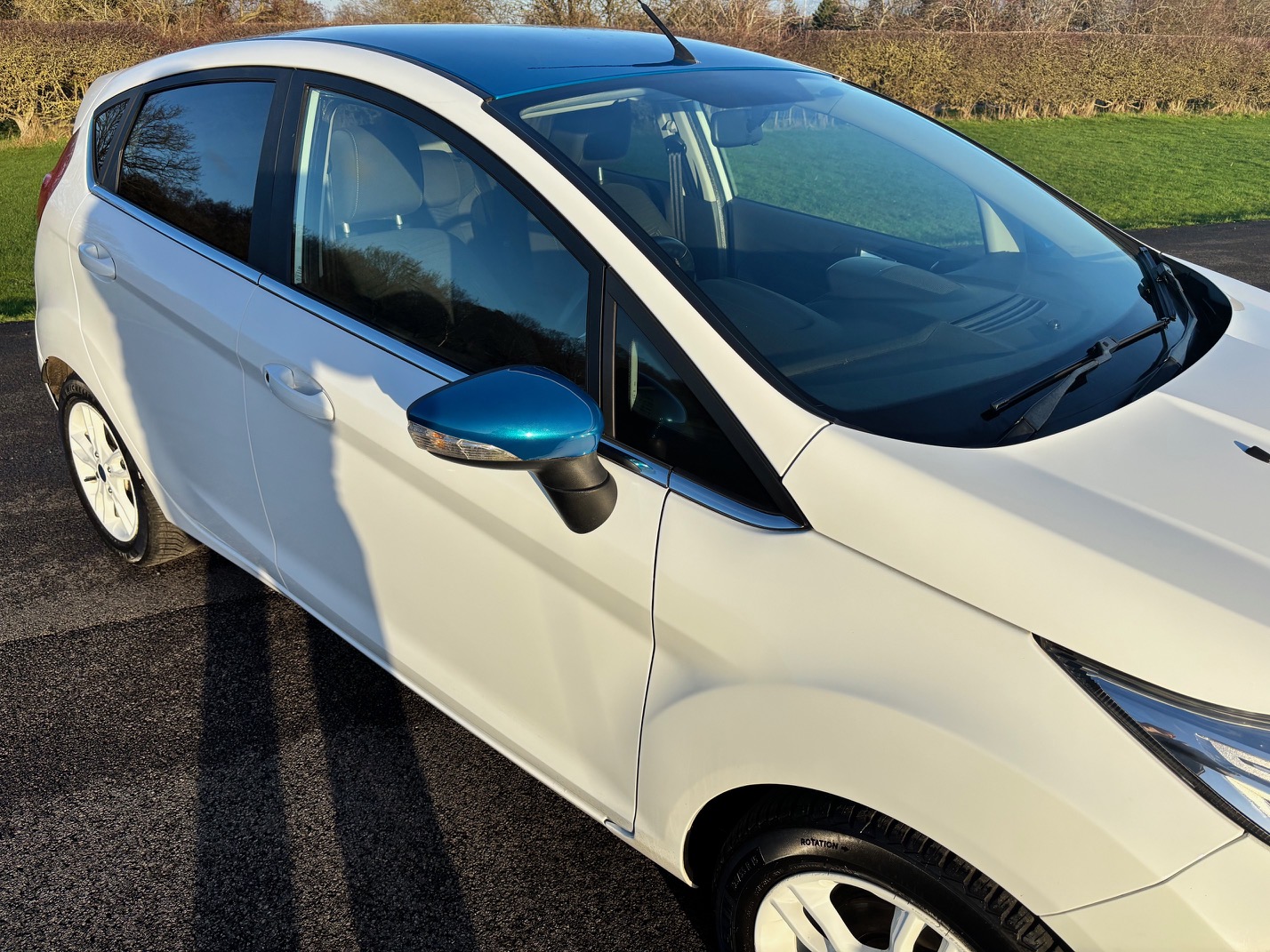 Brilliant white with candy blue contrasting roof and mirror caps.